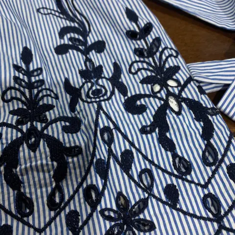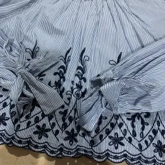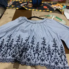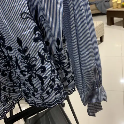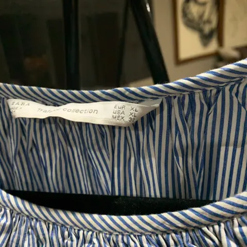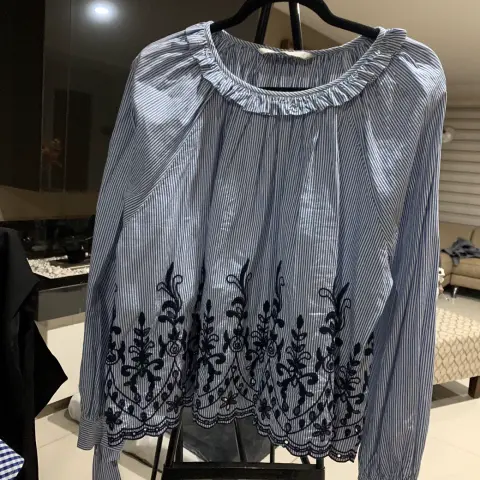 Hermosa blusa azul cielo con rayas blancas y con detalles bordados azul marino talla 32 XL Zara , manga ancha y detalle de Listones en las muñecas , corte A, muy bonita para usar de vestir o con jeans y tenis , medidas axilas 68 , cintura 76, largo 54 ñ, largo manga 61