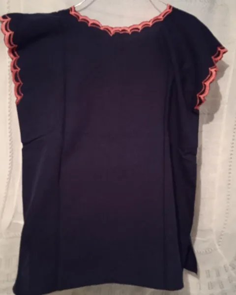 Talla 38En las orillas del cuello y mangas está bordado de color rosa.Cuello redondoLargo 66 cmAncho de A a A 53 cmÚnica tallaÚnico modeloTela Lino