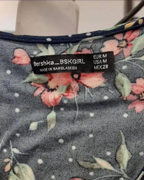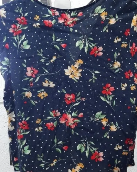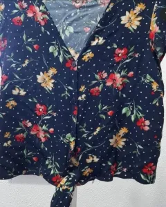 Blusa BSK azul marino con flores, se amarra por debajo. Talla M. Manga corta, sin detalles.