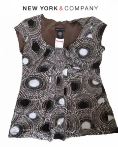 Blusa cafe NEW YORK & COMPANY. Blusa de dama manga corta, en tonos cafe y blanco, talla S, nueva con etiqueta, tiene forro cafe en la parte de abajo para que no se transparente