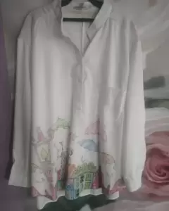 Hermosa y cómoda blusa estampada al frente, manga larga pero puede recogerse, corte A. Medidas dehombro a hombro 50 y 75 de largo, (es como talla M) de axila a axila 58 cm. En excelente estado.