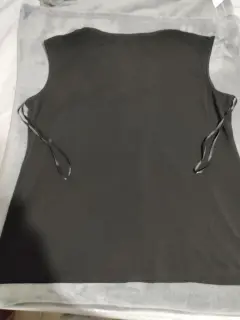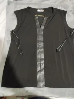 Blusa sin manga con detalle de piel en el centro y cadena en el cuello que sustituye boton. Tela súper cómoda. Súper elegante y bonita, talla L, no tiene ningún detalle