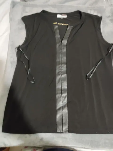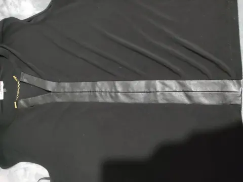 Blusa Calvin hermosa. Blusa sin manga con detalle de piel en el centro y cadena en el cuello que sustituye boton. Tela súper cómoda. Súper elegante y bonita, talla L, no tiene ningún detalle