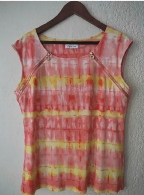Blusa Calvin Klein. Preciosa blusa Calvin Klein en colores muy alegres, fresca, detalles de zipper dorado a los lados con placa metálica con la marca. Una sola puesta, tela de licra. Medidas de axila a axila 55cm y 62 de largo.