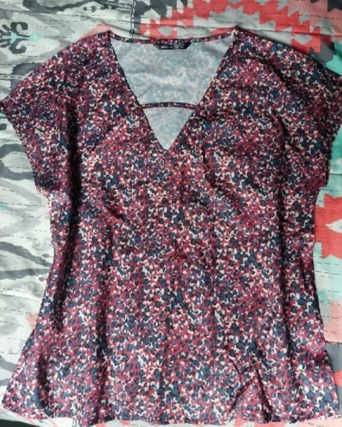 Blusa con estampado de colores talla xs pero viene mas amplia, en la última foto estan las medidas