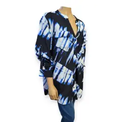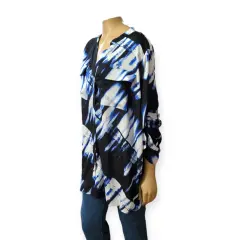 Blusa casual Calvin Klein, talla 2XL, colres azul marino, azul cielo y blanco, cuello en V, manga 3/4 que se convierte en larga, botones frontales, bolsillos en pecho, cola de pato, estilo amplio recto, acento en hombros hecho de poliéster, mide 50cm de hombro a hombro 64cm de axila a axila, 66cm de cintura con 82cm de largo del hombro hacia abajo en buen estado cosmetico.
