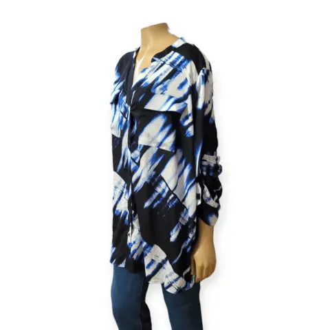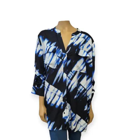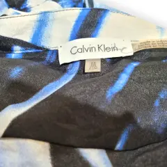 Blusa casual Calvin Klein. Blusa casual Calvin Klein, talla 2XL, colres azul marino, azul cielo y blanco, cuello en V, manga 3/4 que se convierte en larga, botones frontales, bolsillos en pecho, cola de pato, estilo amplio recto, acento en hombros hecho de poliéster, mide 50cm de hombro a hombro 64cm de axila a axila, 66cm de cintura con 82cm de largo del hombro hacia abajo en buen estado cosmetico.