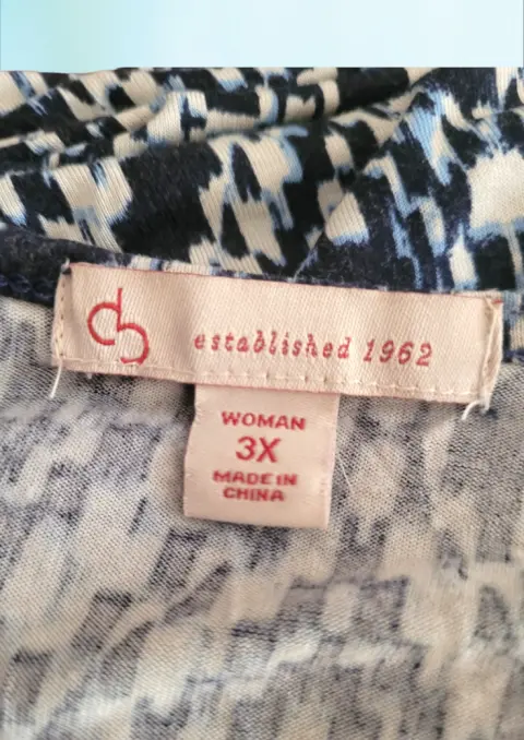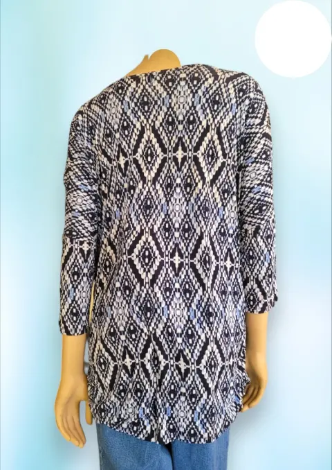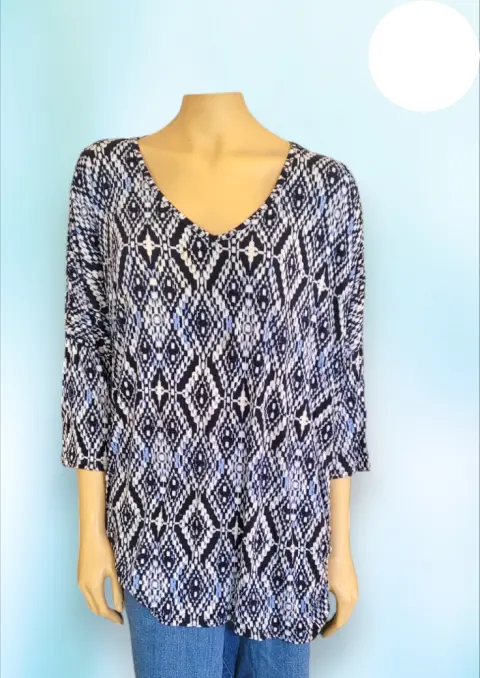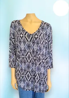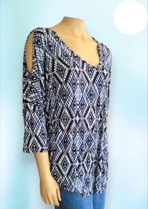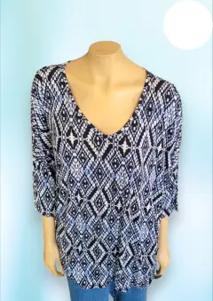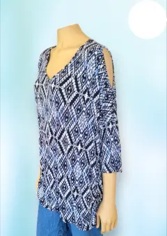 Blusa casual ColdShulder de Established 1962, talla Extra Grande 3X, color azul marino con blanco estampado, cuello redondo, manga 3/4, Hubertus en los hombros, con elastico en orillas, corte recto, hecha de rayon y expandex,53cm de hombro a hombro, 80cm de axila a axila, 51cm de cintura con 76cm de largo del hombro hacia abajo en buen estado cosmetico.