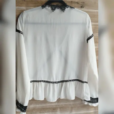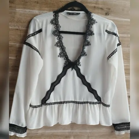 Blusa casual con encaje ZARA. Blusa en color blanco de ZARA, La blusa tiene mangas largas con detalles de encaje, lo que le da un aspecto único y hermoso. Esta blusa, confeccionada con un tejido de encaje ligero, es perfecta para otoño, verano y primavera. Talla sMedidas tomadas por un solo lado:*H-H 37 cm *A-A 48 cm*Largo 55 cm