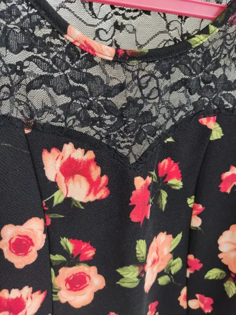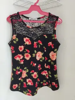 Bonita blusa negra con flores marca Vertiche, talla S. Con detalle de encaje en la parte superior, cuello circular.