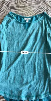 Blusa estilo playera casual, manga larga, color verde turquesa, la parte de atrás tiene transparencia. Es un corte muy cómodo, que queda bien con todo.