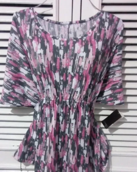 Blusa casual, en estampado fucsia, talla 40, manga corta, con resorte en la cintura.