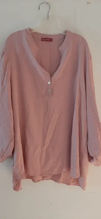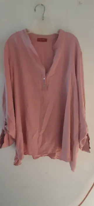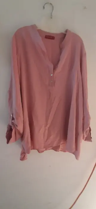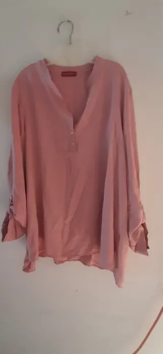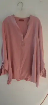 Ligeramente elastica, tono rosa suave. Las mangas se enrollan, cuello redondo, cubre bien el vientre.