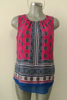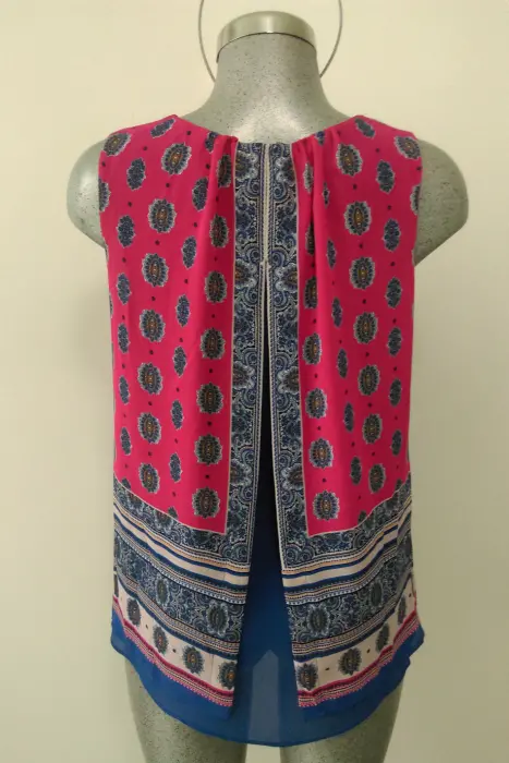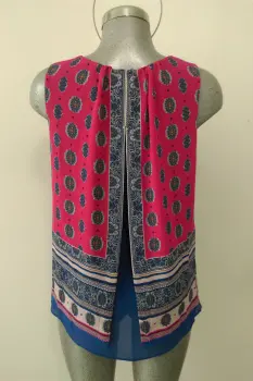 Blusa casual Rose& Olive. Talla MedianaEs una blusa de estilo casual con diseño de escote redondo, sin mangas con terminado en corte U. Fruncido desde escote. Simula dos piezas y abertura trasera.De hermosos colores intensos en tonos azul y rosaTela suave 100% poliéster. No AjustableMarca Rose& OliveTalla MedianaPecho 52 cmAxila/axila 104 cmCintura 100 cmLargo 71 cm