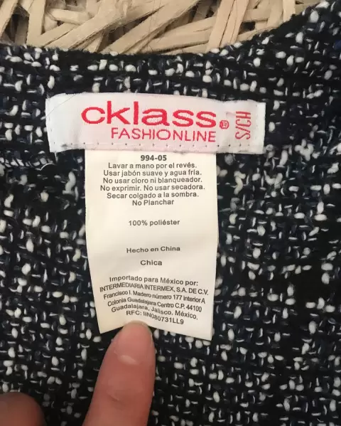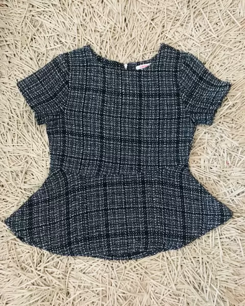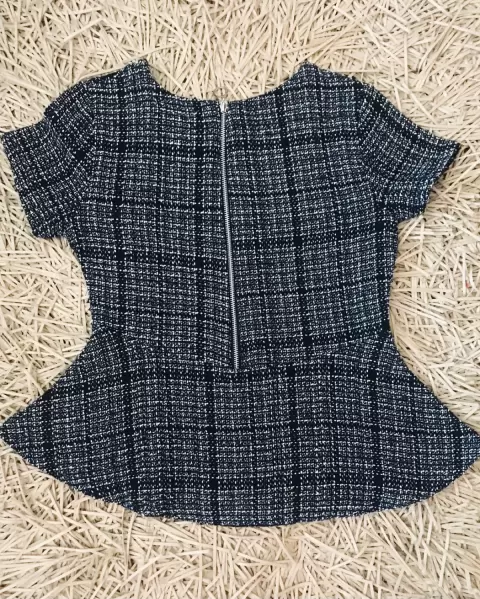 Blusa Cklass azul marino y blanco, cierre trasero, termina en corte semicircular que favorece mucho a la cintura. Está prácticamente nueva.