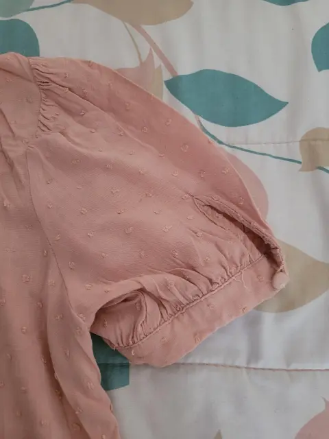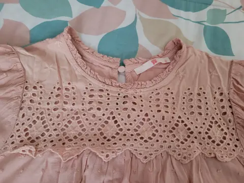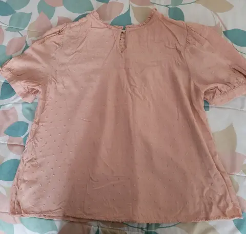 Material: rayón Fit amplioBotones en mangasTalla grande pero el modelo viene ligeramente reducido de mangas y pecho