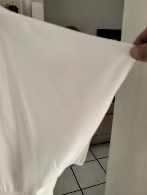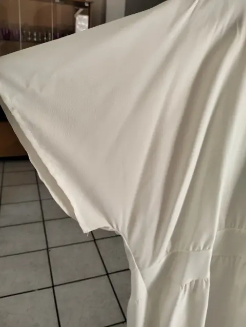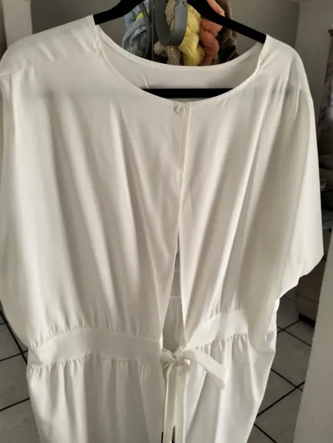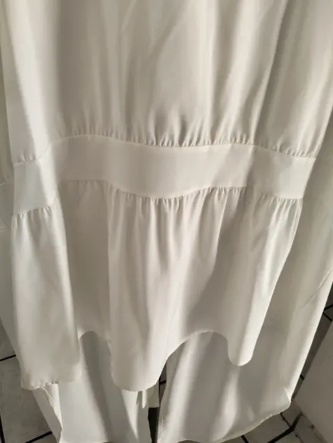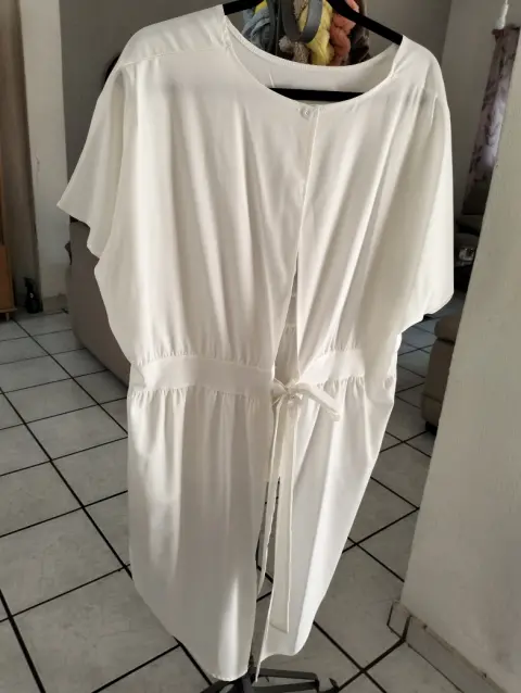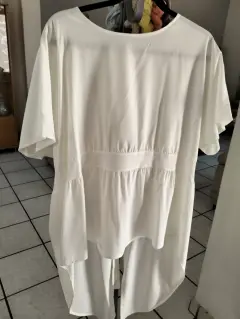 Bonita blusa en blanco perla con cola de pato manga corta olgada con abertura en espalda pretina en cintura