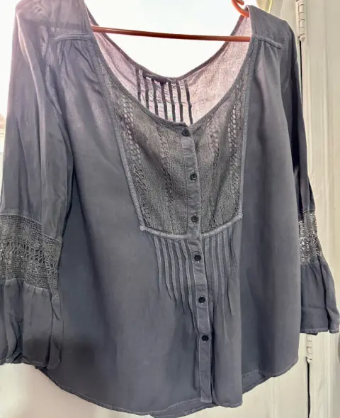 Hermosa blusa color gris tela muy fresca tiene un detalle muy padre en el cuello es manga 3/4 talla M