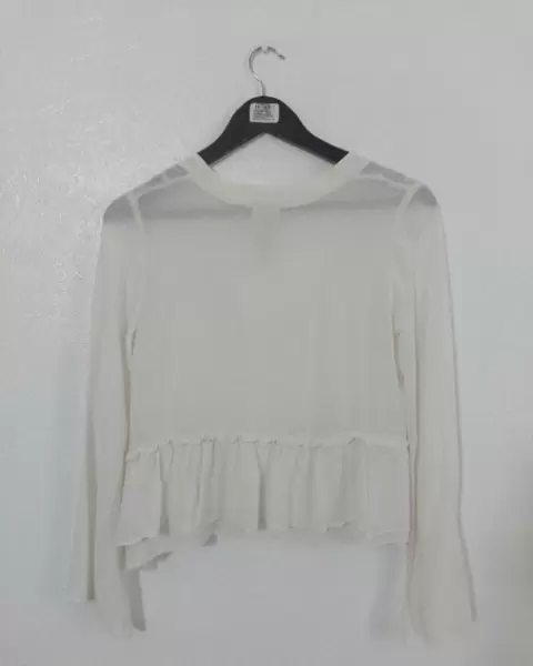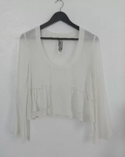 Blusa en buen estado. Sin detalles. Tono hueso. Luce similar a la imagen de referencia (primera foto). Talla XS. La tela es delgadita y si transparenta.De axila a axila: 42 cmLargo: 46 cm