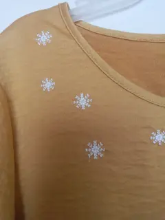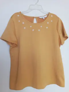 Blusa color mostaza. Blusa de cuello redondo, con flores blancas bordadas debajo del cuello. Cuenta con una abertura en la espalda