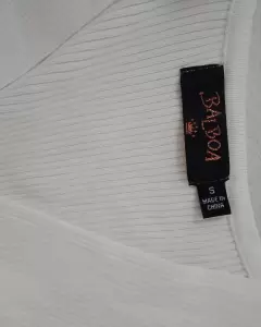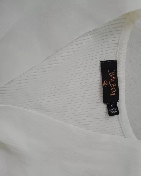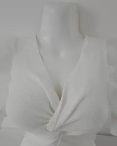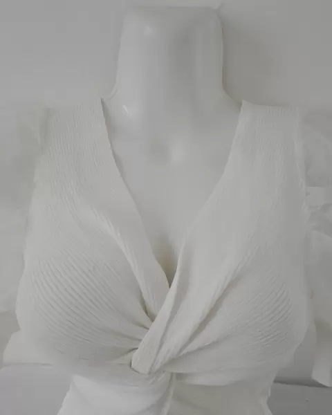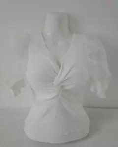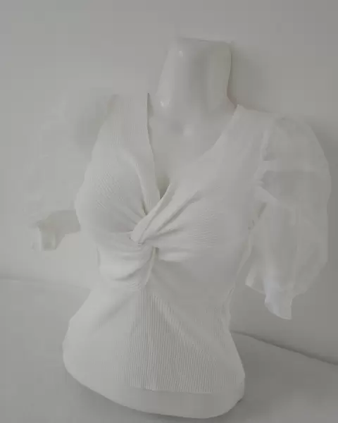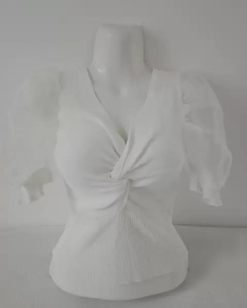 Blusa blanco aperlado, cuello en v, con mangas en organza, tejida , está en muy buenas condiciones se usó muy poco.