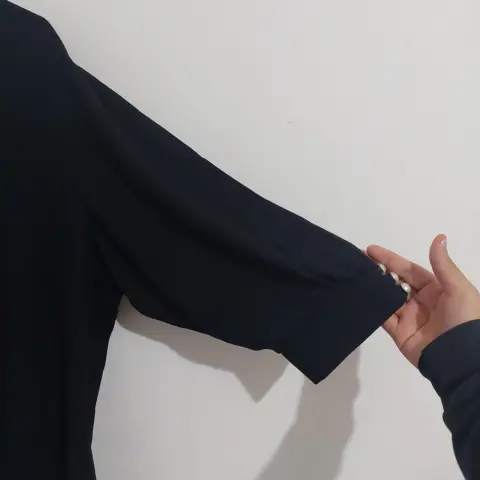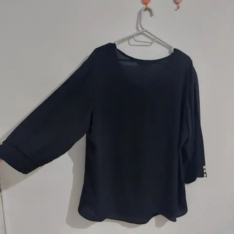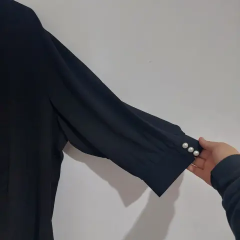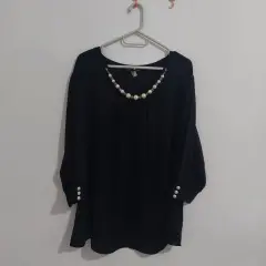 Blusa de color negro con aplicaciones de perlas de fantasía, el tocado del cuello se puede poner y quitar, los botones de las mangas son de color blanco, las mangas son 3/4, la tela es ligera