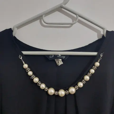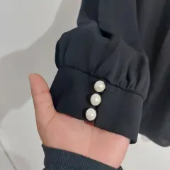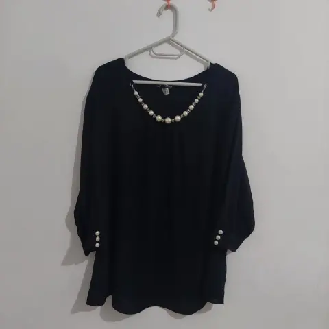 Blusa con aplicaciones de perlas. Blusa de color negro con aplicaciones de perlas de fantasía, el tocado del cuello se puede poner y quitar, los botones de las mangas son de color blanco, las mangas son 3/4, la tela es ligera