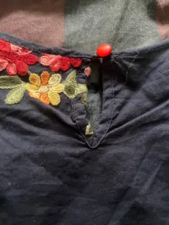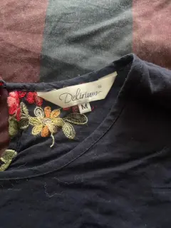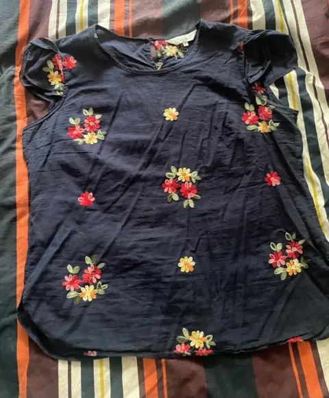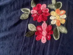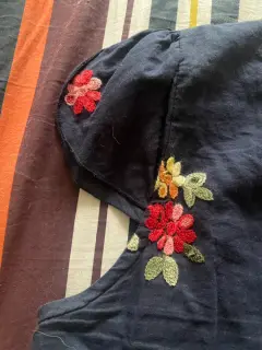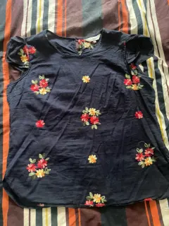 Blusa azul de pequeña manga que apenas cubre el hombro con flores multicolores bordadas