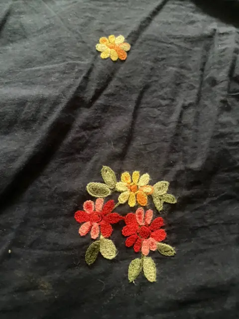 Blusa con bordados floral. Blusa azul de pequeña manga que apenas cubre el hombro con flores multicolores bordadas