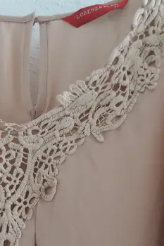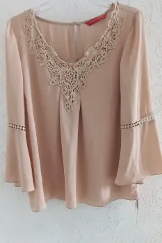 Blusa con encaje en el escote y mangas, la blusa es amplia. Las mangas son 3/4 con caída.