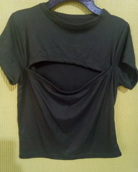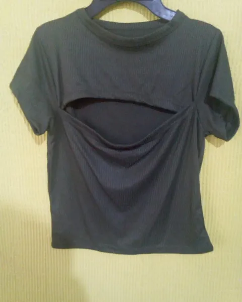 Blusa con escote a la altura del pecho , color verde militar cortita 🥰