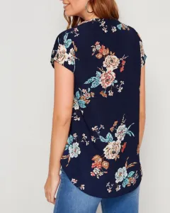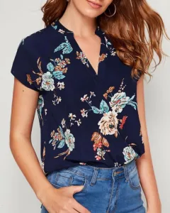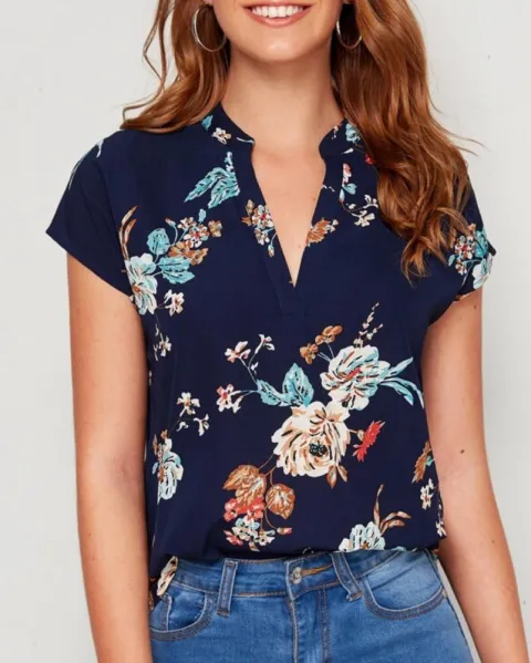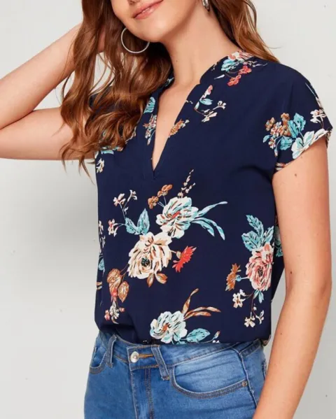 Blusa con estampado floral en V. Blusa azul con estampado floral de cuello cortado V profundo, la puedes combinar perfectamente con jeans blancos y azules, es talla M de Shein.