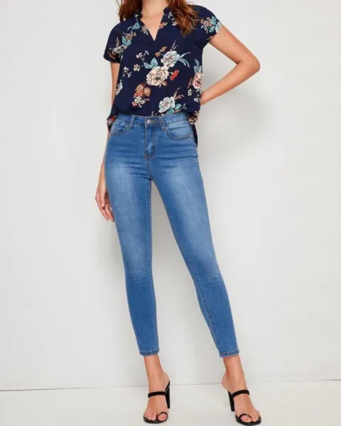 Blusa azul con estampado floral de cuello cortado V profundo, la puedes combinar perfectamente con jeans blancos y azules, es talla M de Shein.