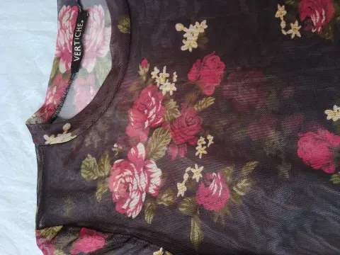 Es de tela suave, transparente, con flores.Se puede usar sola o con una blusa básica, debajo.