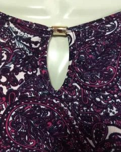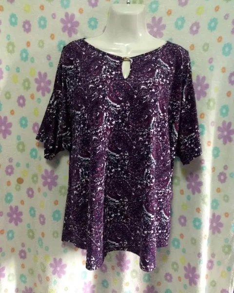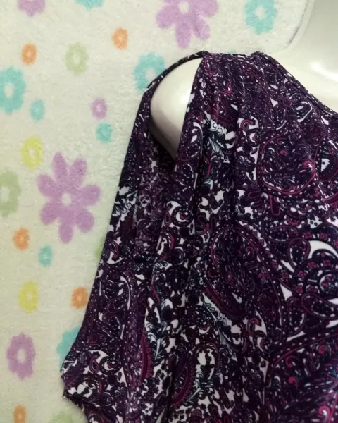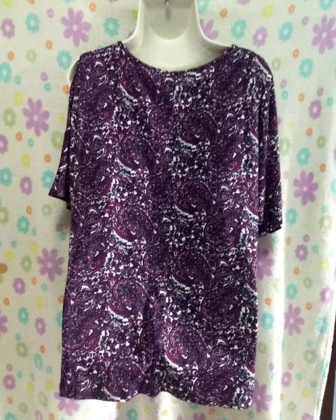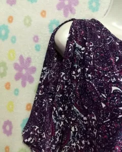 Bonita blusa manga corta y hombros descubiertos, y aplicación en el escote, tela muy suave, color morado con blanco, sin detalle.