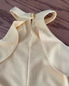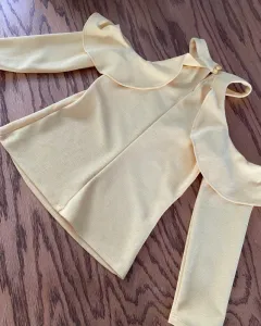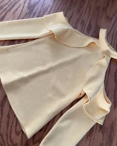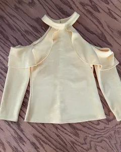 Blusa manga larga con olanes, hombro descubierto, con botones en la parte del cuello