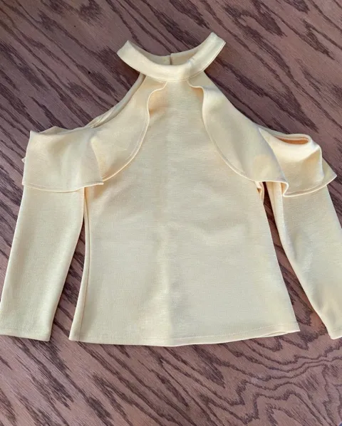 Blusa con manga larga hombros descubiertos. Blusa manga larga con olanes, hombro descubierto, con botones en la parte del cuello