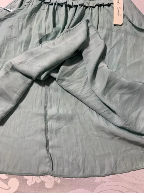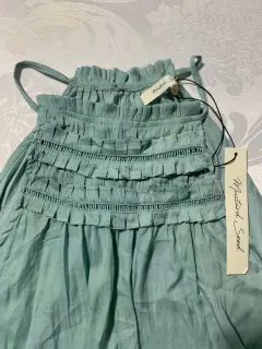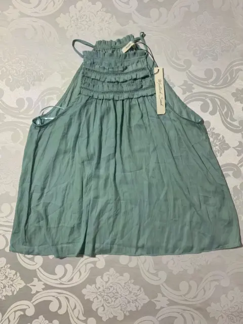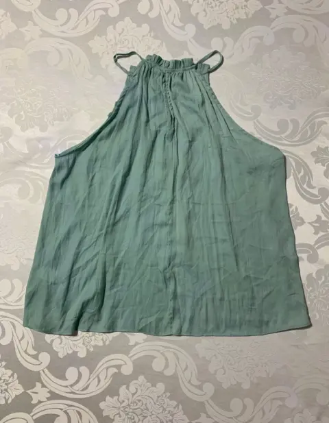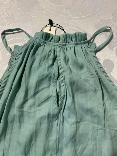 Blusa sin mangas, tela ligera, cuello alto con pequeños olanes. Corte en A.Medidas/ busto: 56 cm, cintura: 66 cm, largo: 65 cm.