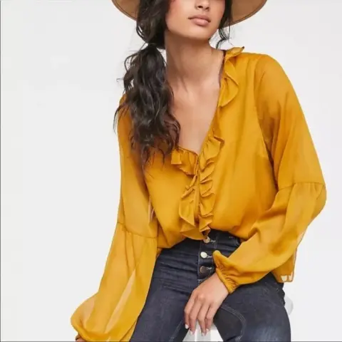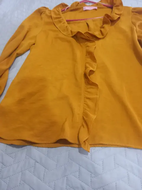 Blusa con olanes mostaza. Hermosa blusa con olanes y manga larga color mostaza, bellos olanes delgados en escote, caida super fluida de buena calidad talla 32 mx mide de axila a axila 55cm largo desde hombro 61cm