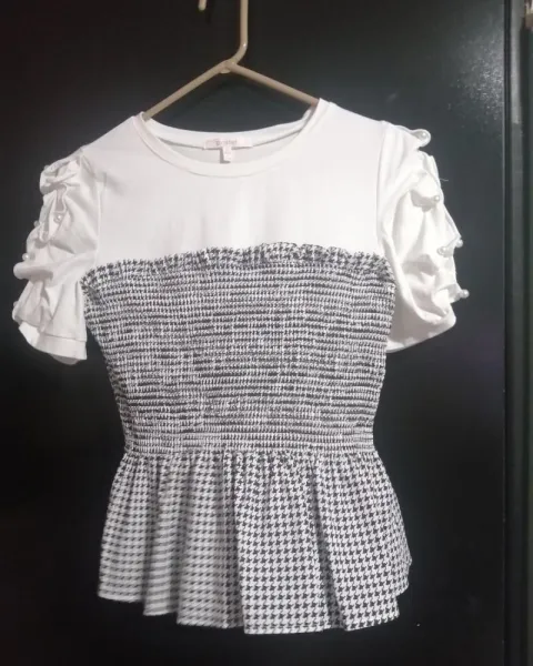 Blusa con perlas en las mangas , simula arriba un strapple de cuadros tiene elástico