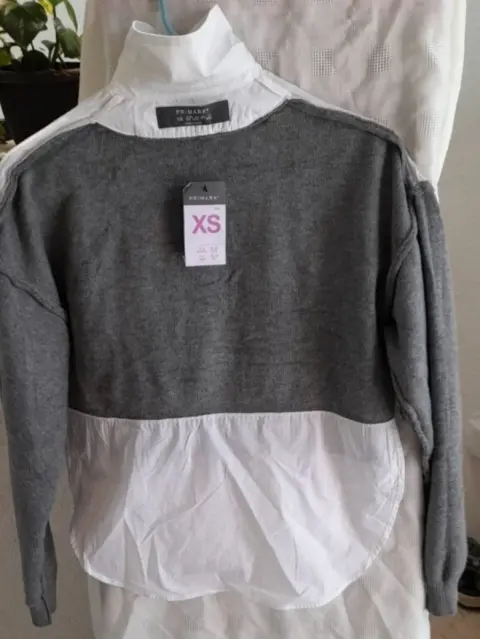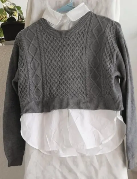 Blusa con sueter. Linda blusa con sueter color gris oxford, es delgado el sueter,es nueva la prenda, talla,XS ,esta en buenas condiciones. Medidas,hombro a hombro-52, axila a axila-47, largo del sueter-33, largo manga-50,total del largo-53. Material poliester algodón.