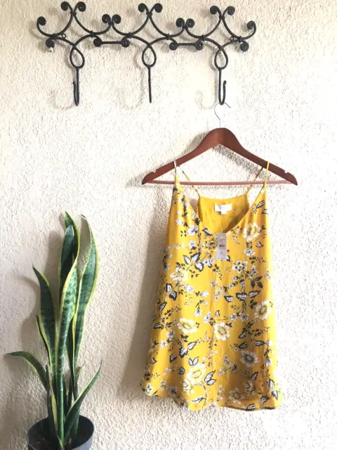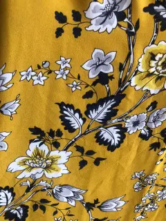 Blusa fresca con tirantes, color amarillo mostaza con adornos de flores y diseños blancos.