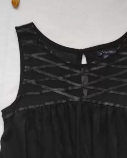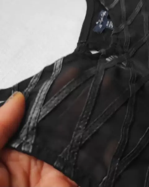 Bonita blusa con transparencia en pecho y tintas satinadas tipo piel.Hombro 30 cmBusto 40 cmSisa 18 cmLargo total 57cm