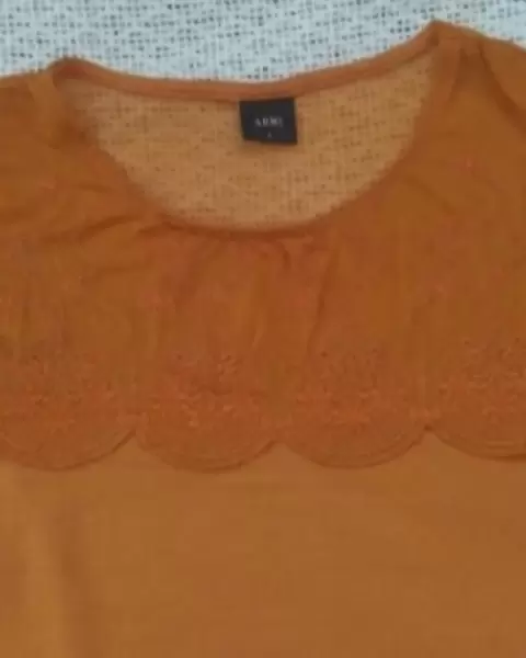 Blusa con transparencias y bordados. Blusa color naranja ocre con escote y mangas transparentes con hermosos bordados florales.