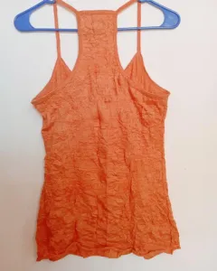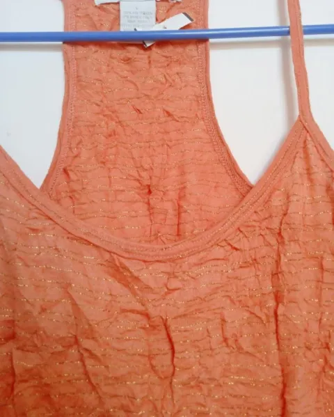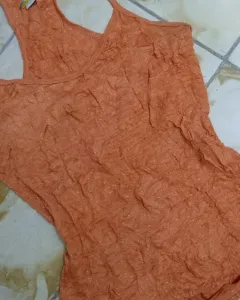 Blusa de resaque con tirantes. Color naranja con gliters dorados. Es de tela strech corrugada, estira bastante. Es de tela muy suave y brilla muy bonito. Queda a talla grande y extragrande.