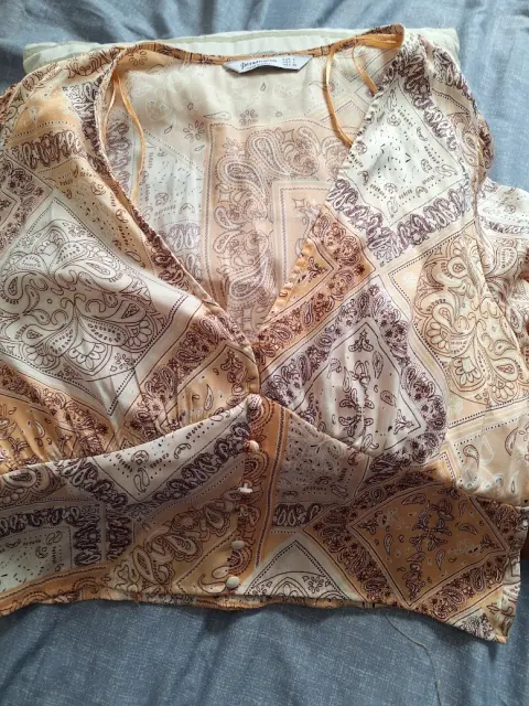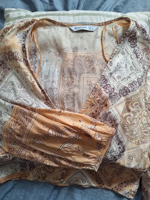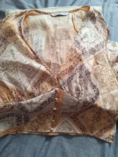 Blusa corta. De diseño actual ideal jovenes, con escite en V, profundo y maga larga abultada, tela lugera y con fino estampado en colores beige , neutra combina con todo sin ser formal