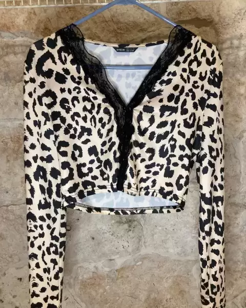 Blusa corta con estampado. Blusa corta de manga larga con estampado de leopardo, encaje en escote, tela muy suave