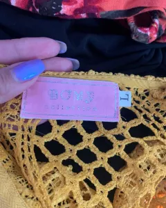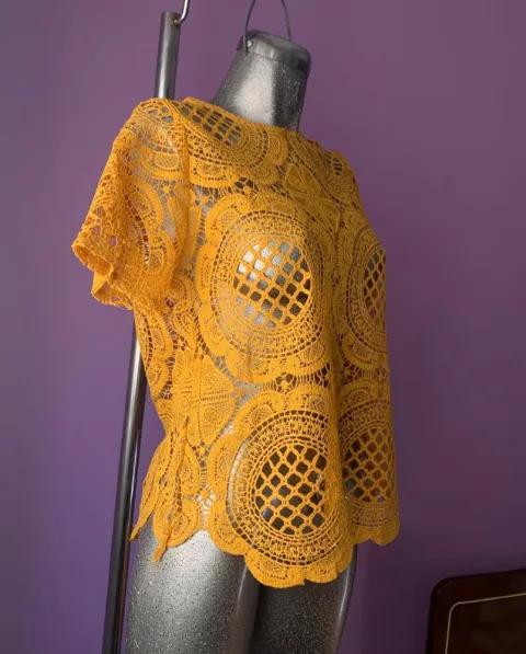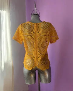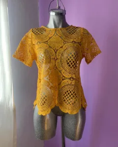 Hermosa blusita tipo crochet, de manga corta y cierre en la parte de atrás. Es de color amarillo mostaza. Talla chica, también le va a una mediana.