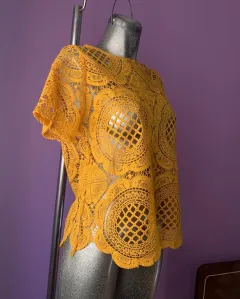 Blusa crochet amarilla. Hermosa blusita tipo crochet, de manga corta y cierre en la parte de atrás. Es de color amarillo mostaza. Talla chica, también le va a una mediana.