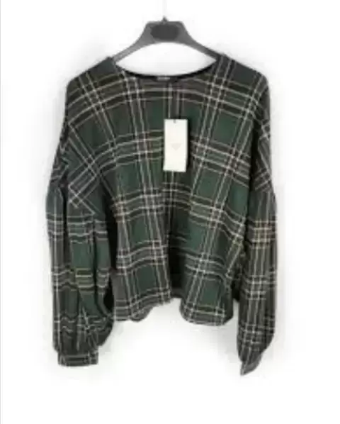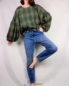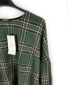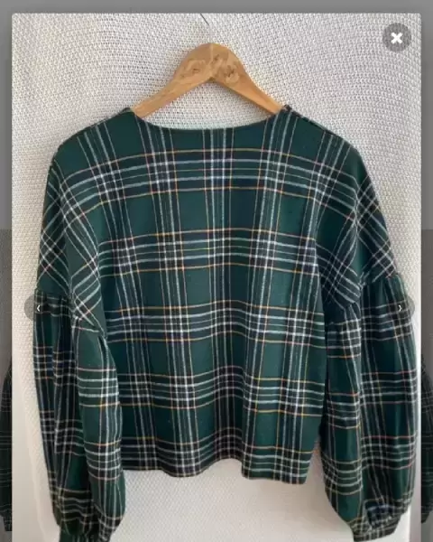 Hermosa blusa de cuadros verde, con mangas abombadas, tela muy cómoda. Te cubre perfecto pero no está demasiado caliente, puede usarse en esta temporada por la nochesita.